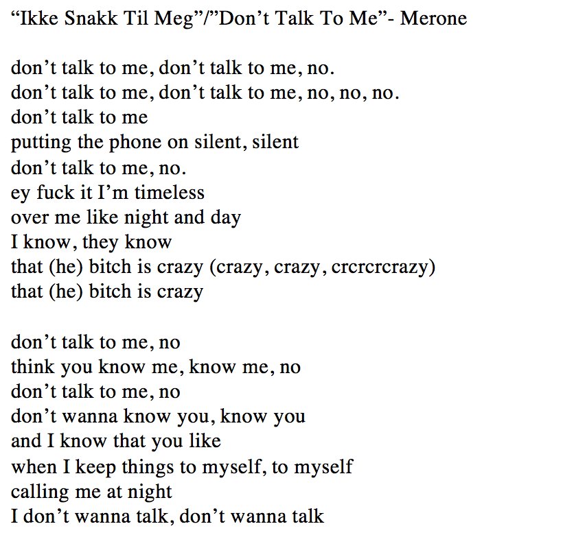 Ikke Snakk Til Meg | Music video by merone performing ikke snakk til meg. Ikke snakk til meg merone 2016. Make social videos in an instant: Og jeg vet at du liker når jeg holder alt ting tilbake, alt ting tilbake. Listen to ikke snakk til meg in full in the spotify app.
